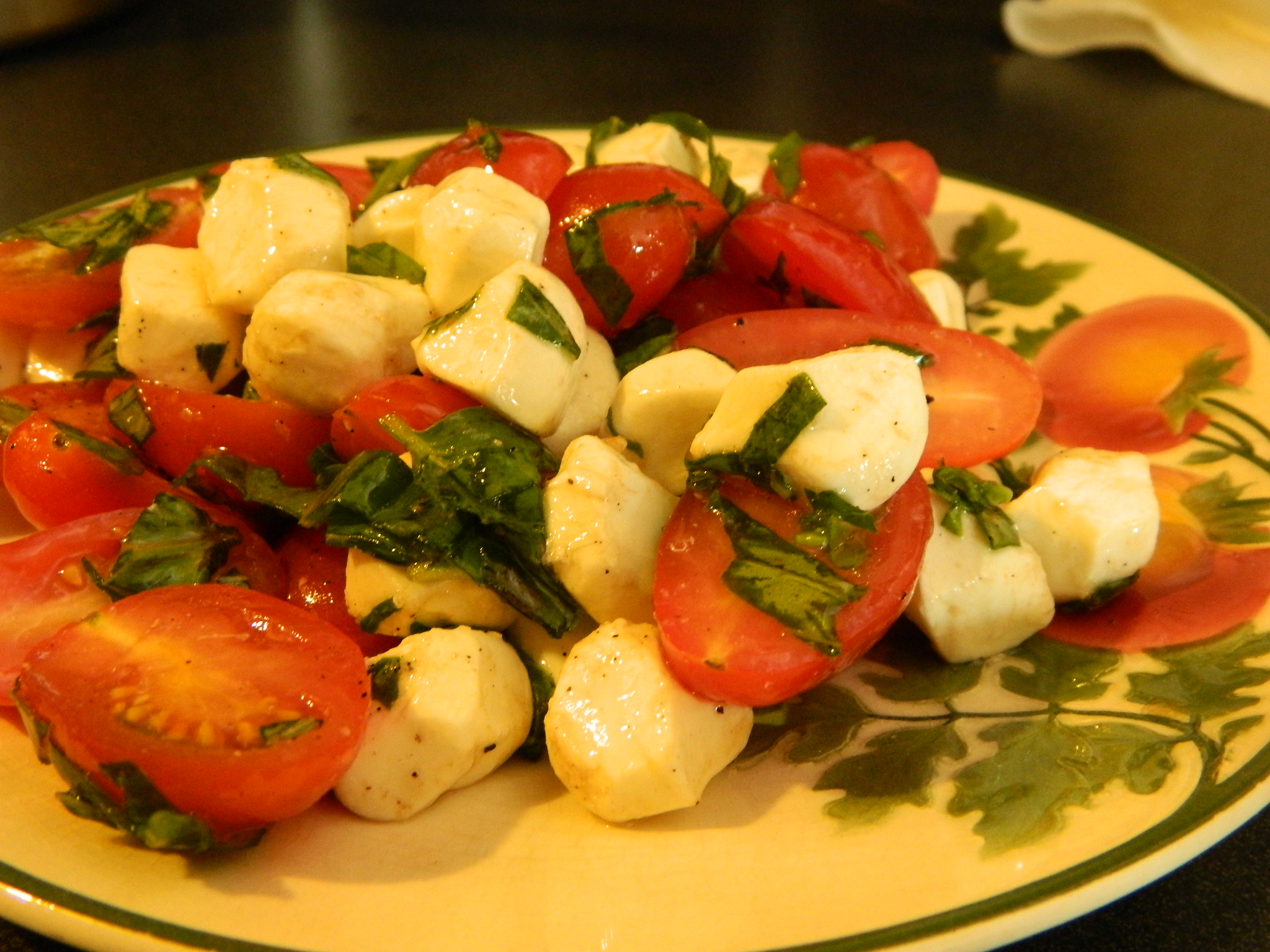 At any rate, I love making tomato dishes for the lucky folks in my life that get to eat these juicy bits of (imagined) deliciousness. A summer favorite around my house is Ensalata Caprese. Now, there are a hundred variations on this old theme, but basically it’s just tomatoes, basil, moz cheese, and some balsamic and olive oil. Here, I’ll show you.